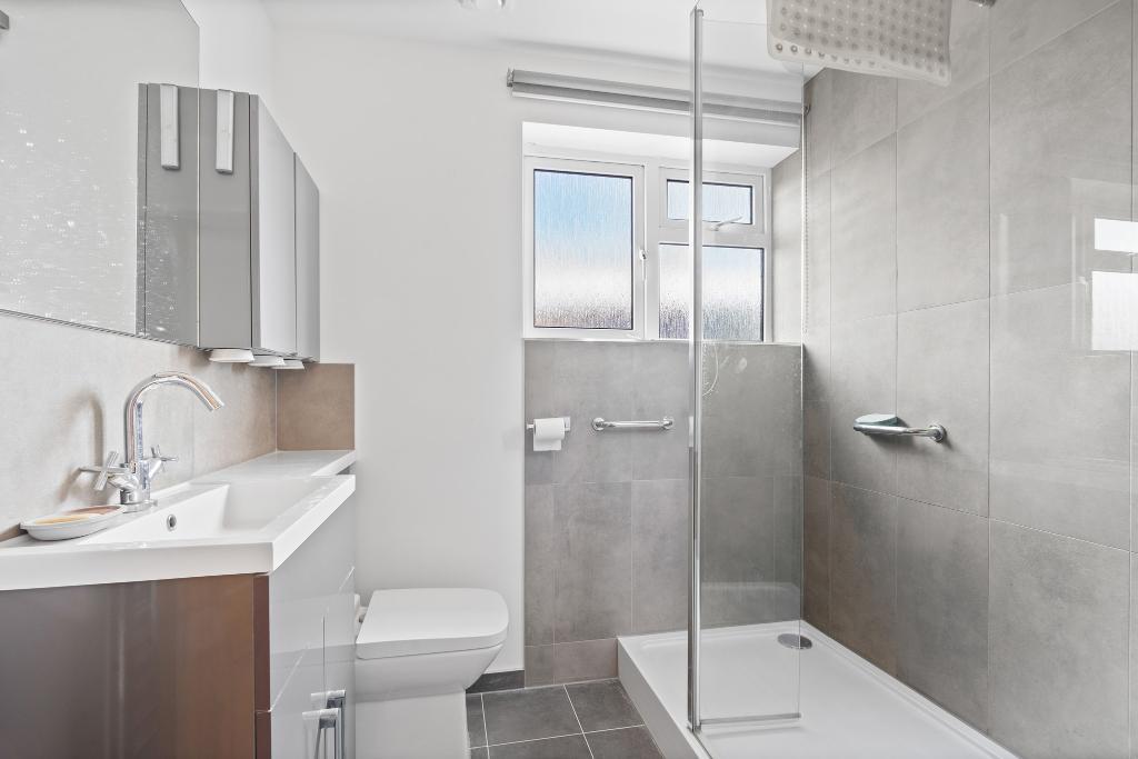 about 6'9 x 6'6 (2.06m x 1.98m) Modern suite. Wash basin with vanity cupboard below, WC and walk in shower with fixed glass screen and Aqualisa shower unit. Heated towel rail.