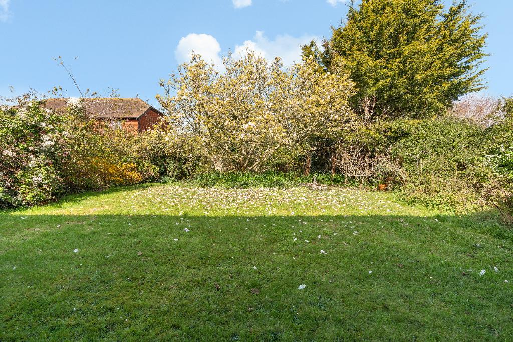 Back garden about 54ft x 54ft (16.5m x 16.5m) Mainly with area of lawn surrounded by a selection of established planting including a feature magnolia tree, shrubs and flower borders. Timber clad shed.