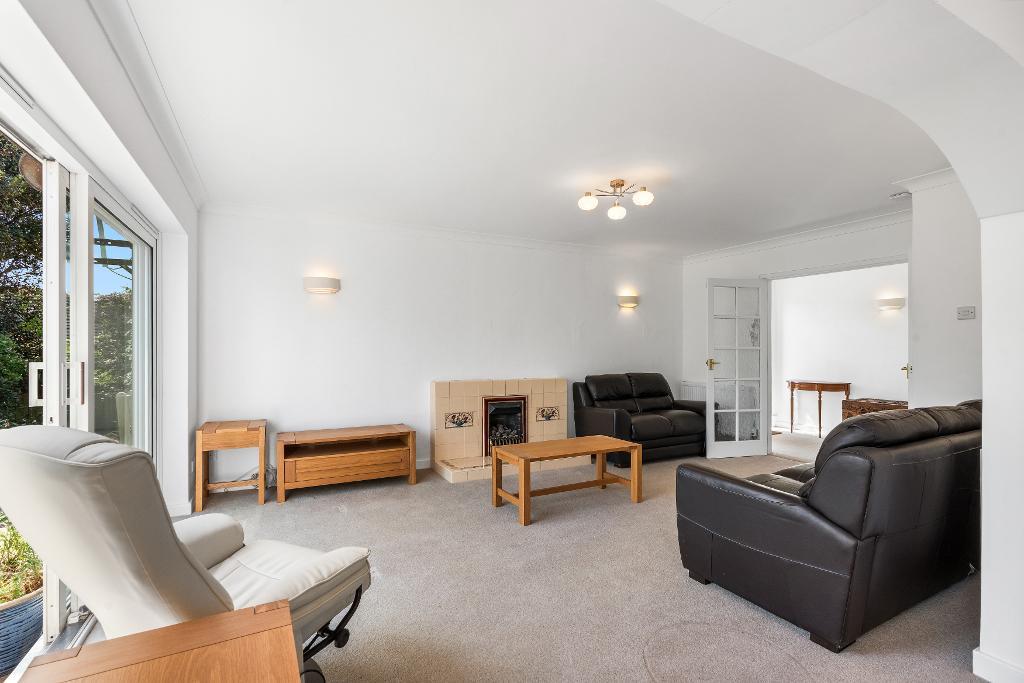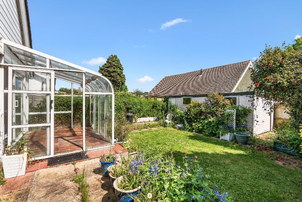 The property occupies a corner plot. Open area of lawn to the front and side of the bungalow. A path leads to the front door. Parking space accessed from Lower Drive. Enclosed back garden, mainly of lawn with patio and established planting. Garage with own driveway.