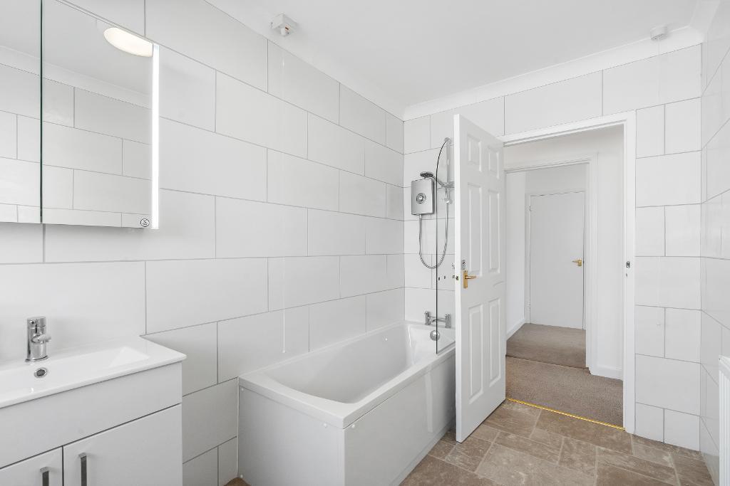 Fitted with a new matching white suite and comprising panelled bath with Triton shower unit above, wash basin with vanity cupboard below and wall mirror cupboard above, WC.