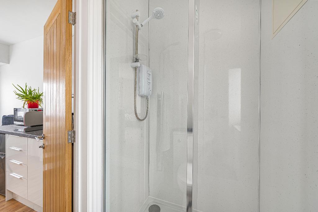 Fitted with a matching white suite comprising shower cubicle with electric Triton shower unit, wash basin with vanity cupboard below and WC. Concealed, wall mounted gas boiler. Heated chrome towel rail.