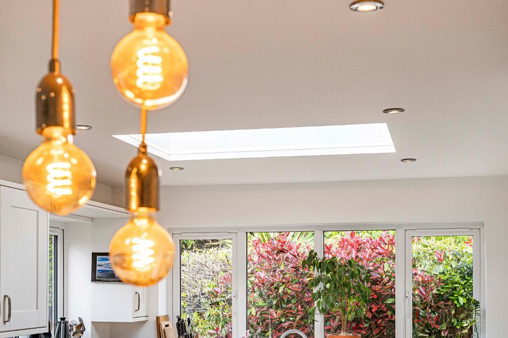 about 21'9 x 9'10 (6.63m x 3.00m) Triple aspect room with glazed roof lantern. Door opens to the side of the property. Kitchen fitted with a range of matching units comprising wall cupboards and worktops with cupboards and drawers below. Breakfast bar. Space for cooker with extractor hood above. Inset sink and drainer. Space and plumbing for dishwasher. Integrated washing machine and tumble dryer. Space for fridge freezer. Open to the dining room.